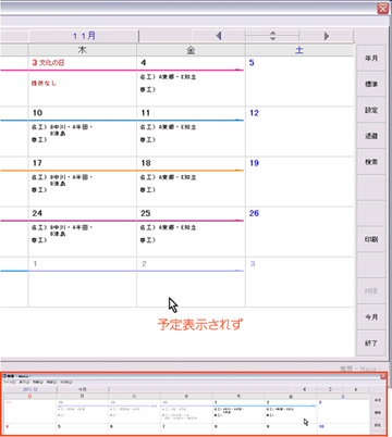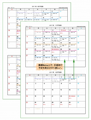 ▼ くりさん > 添付画像も荒いので分かりにくいかと思いますが、11月の予定にも12月の1日・2日の予定が半透明で表示してほしい。という事なのです。 添付画像で確認しました。 結論から言えば、これは仕様であって、 4ヶ月目のものを表示させるには基本設計から変更しなければ成りません。 申し訳ございませんが、たぶんこのご要望にはお応えできないと思います。