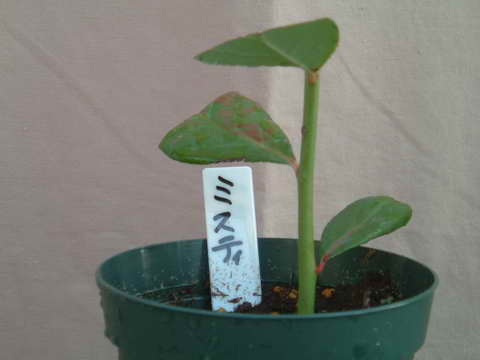 2009年10月18日 こだわり苑さんから、ミスティーの接ぎ木苗を購入しました。葉の大きさが面積比で4倍くらい違います。