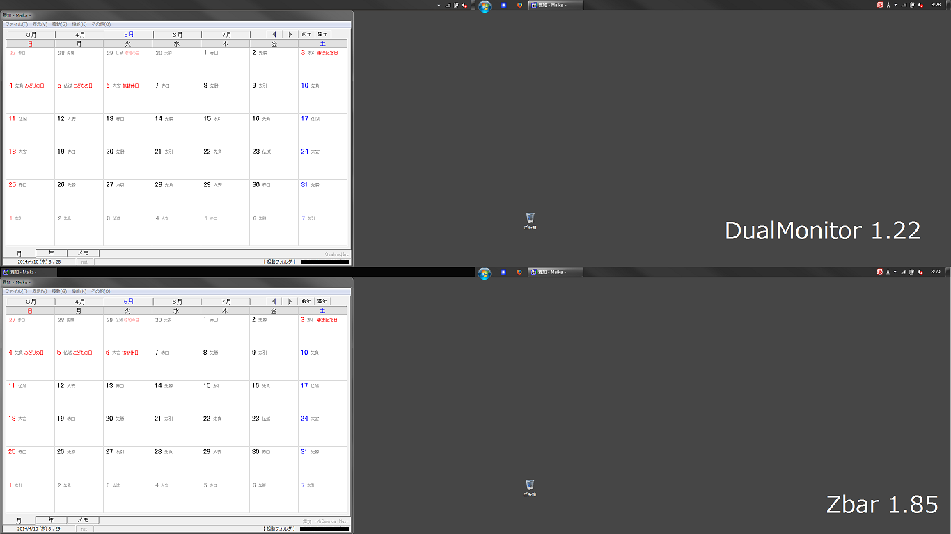 別の仮想タスクバー表示ソフト(Zbar 1.85)でも試したところ、こちらではメイン・サブ両方のタスクバーにタスクアイコンが表示されました。