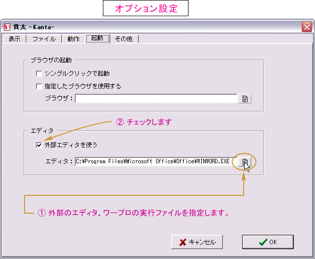 一般のエディタでは出来ない行間や文字間の指定等を他のエディタやワープロを、貫太から起動することにより体裁よく印刷することができます。