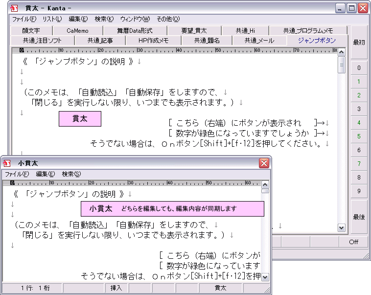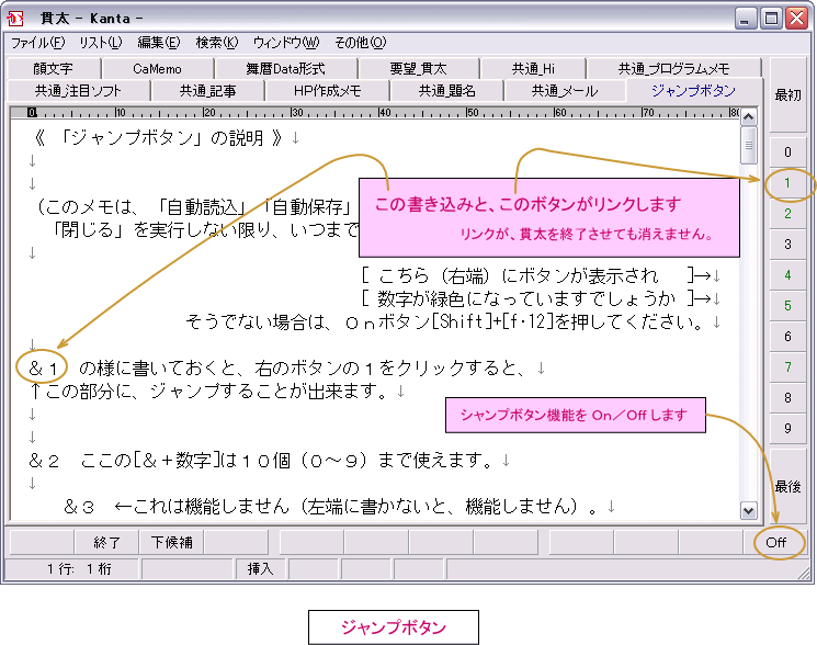 タブ型エディタでいくつものテキストにメモを書き込めますし、その上、1つのテキストに10個までのジャンプ場所を設定できます。そして、そのボタンのジャンプする行位置は次回起動時にも使用できます。