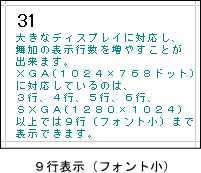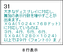 XGA(1024×768ドット)に対応しているのは、3行、4行、4行(フォント大)、5行、6行(フォント小)、SXGA(1280×1024ドット)以上では6行(フォント大)、7行、8行、9行(フォント小)にも対応しています。