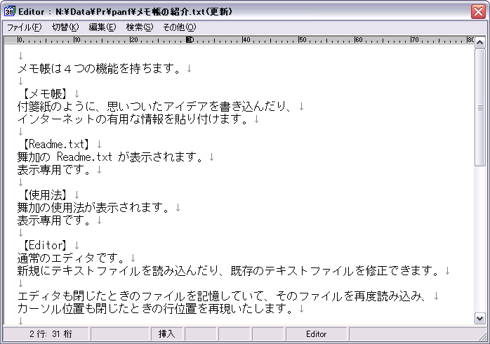 もちろん、エディタモードでも、保存したときのカーソルの行位置を再現してそのテキストファイルを表示します。