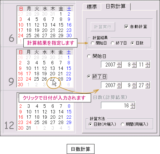 日数は、両端入れ、片端入れを選択できますし、この日からこの日までの日数の他、この日から何日後、この日の何日前という日付も求めることが出来ます。