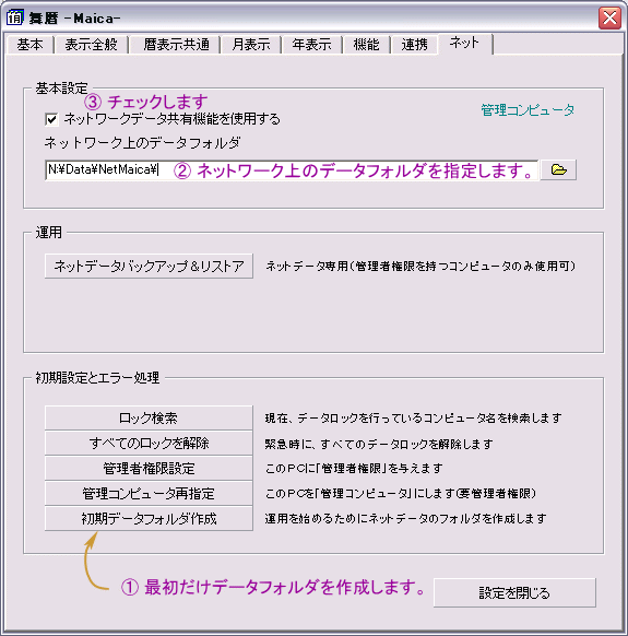 以下は「ネット舞暦」運用のために、ネットフォルダを指定し、データ構造を作成するための方法です。