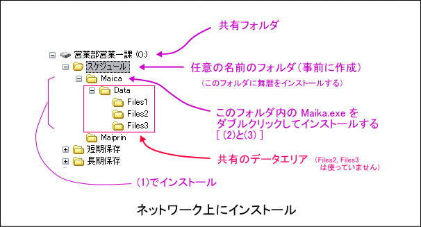 | Ver5.1.5 までのバージョンで、すでにネットフォルダを作られている方も、そのフォルダに舞暦をインストールすることをお勧めいたします。 インストールするフォルダは、オプション設定ネットタブにある「ネット上のデータフォルダ」です。 言い換えますと、Data\Files1\が入っているフォルダです。 例えば、N:\総務部会計課\スケジュール\Data\Files1\ となっていると、N:\総務部会計課\スケジュール フォルダに、インストールします。 インストール時に、「セットアップの場所」として、上記フォルダを指定してください。 すると、N:\総務部会計課\スケジュール フォルダに maica.exe がインストールされますので、その maica.exe を下記「(2)」「(3)」の様にダブルクリックして、メンバのPCにインストールしてください。 |