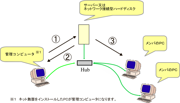 ・「(1)」でネット舞暦をインストールしたPCが(ネット舞暦を管理する)管理コンピュータになります。 ・「(1)」での設定が、新規メンバーの設定初期値になります。 |